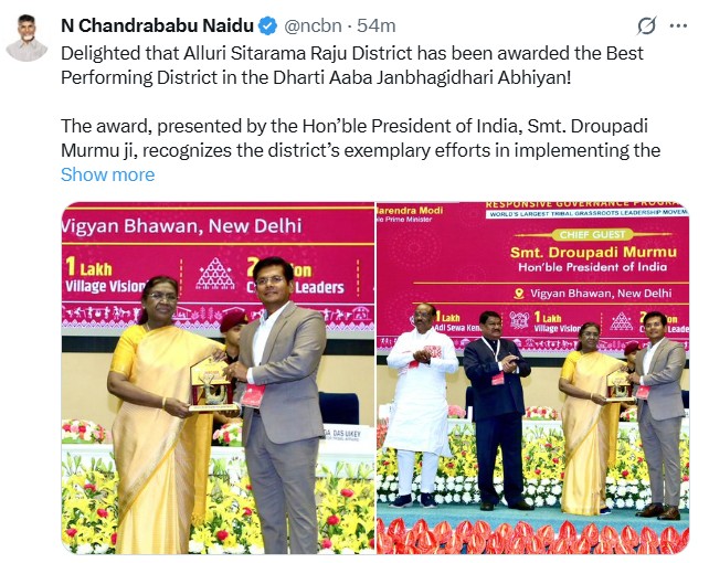 అల్లూరి జిల్లాకు జాతీయ పురస్కారం రావడంపై సీఎం చంద్రబాబు హర్షం