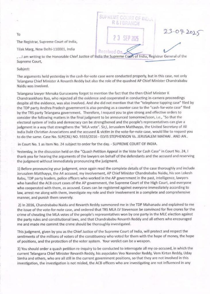 చంద్రబాబు ప్రోత్సాహం మేరకే తాను ఓటుకు నోట్లు కేసులో తప్పు చేశానని సీజేఐకి రాసిన లేఖలో పేర్కొన్న మత్తయ్య