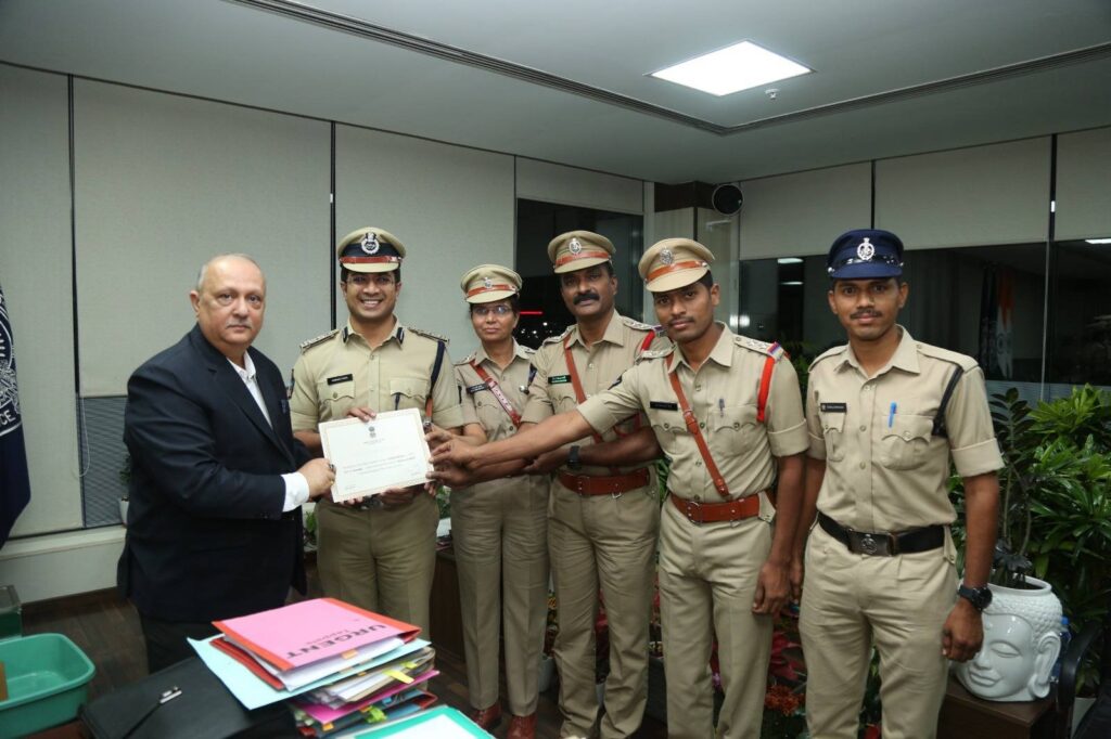 On this occasion, the “Certificate of Excellence” award was received today at the AP Police Headquarters in Mangalagiri by DIG and Kurnool District In-charge SP Vikrant Patil, IPS, Emmiganur DSP Bhargavi, Kosigi Circle Inspector B.A. Manjunath, and Peddakadubur SI Niranjan Reddy, from the hands of the State DGP Harish Kumar Gupta, IPS. The DGP congratulated all of them.