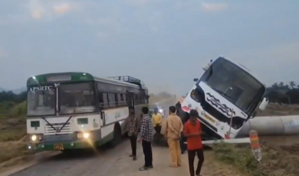 పల్నాడు జిల్లా, రెడ్డిగూడెం వద్ద అదుపుతప్పి గుంటలోకి దూసుకెళ్లిన ప్రైవేట్ ట్రావెల్స్ బస్సు.
