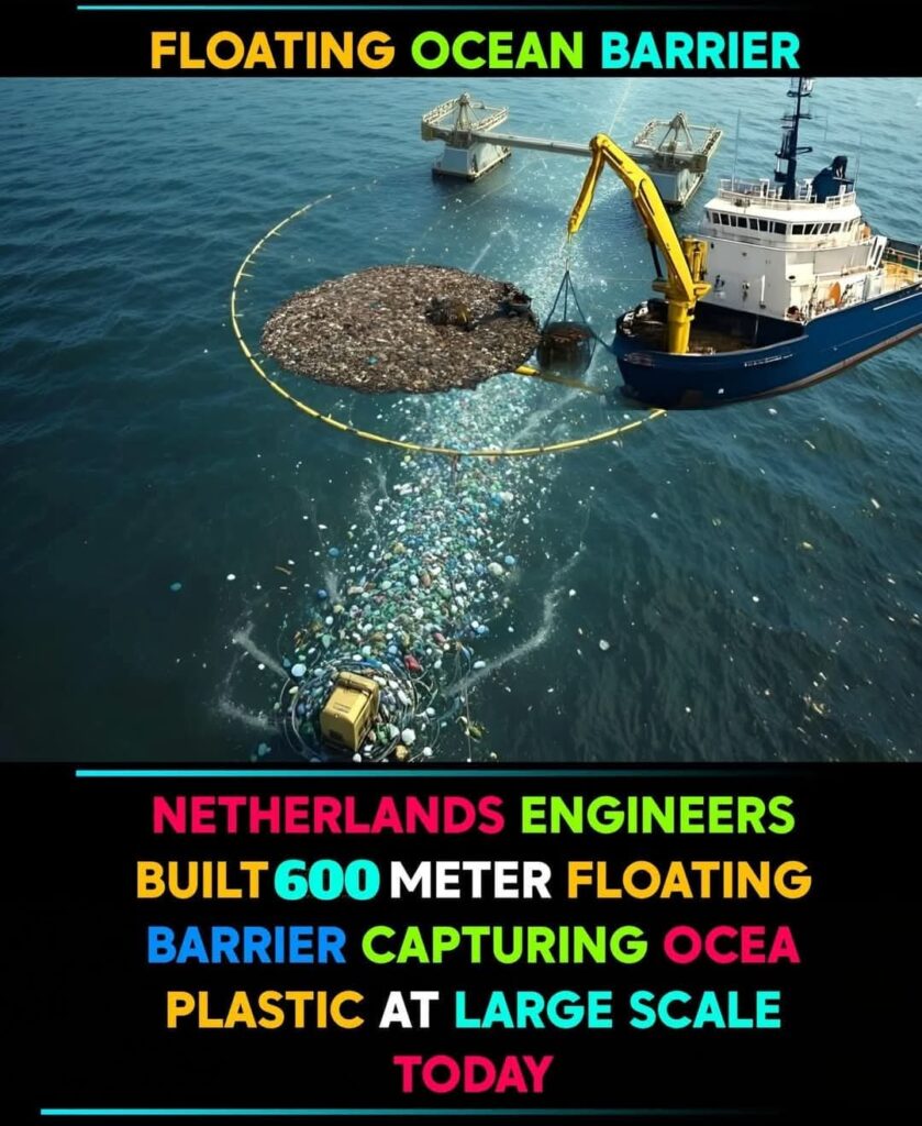 నెదర్లాండ్స్‌లోని ఇంజనీర్లు సముద్ర ఉపరితలం నుండి ప్లాస్టిక్ వ్యర్థాలను సేకరించే 600 మీటర్ల తేలియాడే అవరోధాన్ని సృష్టించారు.