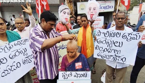 వైజాగ్ స్టీల్ ప్లాంట్ ప్రైవేటీకరణ చేయకూడదని … కాంటాక్ట్ కార్మికులను వెంటనే విధుల్లోకి తీసుకోవాలని డిమాండ్ చేస్తూ …. విశాఖ జిల్లా జగదాంబ జంక్షన్ దగ్గర అఖిలపక్ష కార్మిక ప్రజా సంఘాల ఆధ్వర్యంలో గురువారం నిరసన చేపట్టారు. స్టీల్ ప్లాంట్ కాంటాక్ట్ కార్మికుల తొలగింపును ఆపాలన్నారు. కార్మికుల, నాయకుల సస్పెన్షన్లు, షోకాజ్ నోటీసులు, వార్నింగ్ లెటర్లను రద్దు చేయాలన్నారు. స్టీల్ కార్మికులపై రాష్ట్ర ప్రభుత్వ పోలీసుల నిర్బంధాన్ని ఆపాలని డిమాండ్ చేశారు. ఈ సందర్భంగా సిఐటియు నాయకులు ఎం.సుబ్బారావు, పి.మణి, వై.రాజు, డివైఎఫ్ఐ నాయకులు బిఎస్ఎన్ రాజు, తదితరులు పాల్గొన్నారు. పలువురు నేతలు గుండు కొట్టించుకొని తమ నిరసనను వ్యక్తపరిచారు.