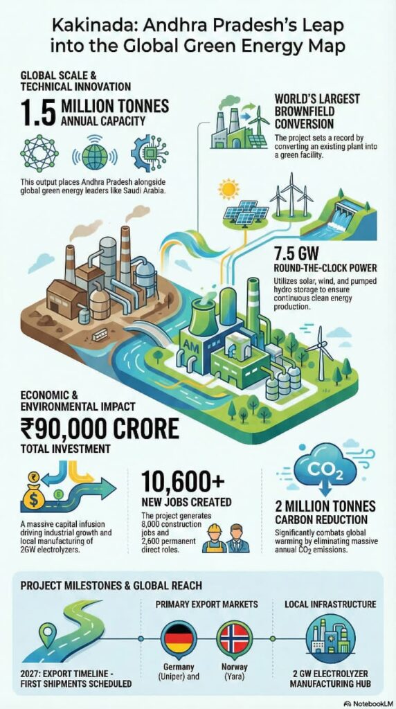 ఉపాధి మరియు ఆర్థిక ప్రగతి: ₹13 వేల కోట్ల (ప్రాథమిక) నుంచి ₹90 వేల కోట్ల (మొత్తం) భారీ పెట్టుబడితో రానున్న ఈ ప్రాజెక్టు ద్వారా సుమారు 8,000 మందికి నిర్మాణ దశలో, 2,600 మందికి ప్రత్యక్షంగా ఉద్యోగాలు లభిస్తాయి. ఇది కాకినాడను కేవలం పోర్టు నగరంగానే కాకుండా, అంతర్జాతీయ ‘క్లీన్ ఎనర్జీ గేట్వే’గా మారుస్తుంది.