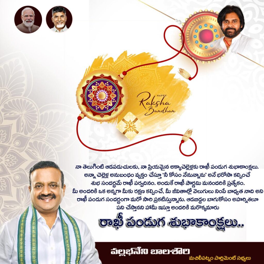 భారత్ న్యూస్ గుంటూరు …Ammiraju Udaya Shankar.sharma News Editor….నా తెలుగింటి ఆడపడుచులకు, నా ప్రియమైన అక్కాచెల్లెళ్లకు రాఖీ పండుగ శుభాకాంక్షలు. అన్నా చెల్లెళ్ల అనుబంధం వ్యక్తం చేస్తూ ‘నీ కోసం నేనున్నాను’ అనే భరోసా కల్పించే శుభ సందర్భమే రాఖీ పర్వదినం. అందుకే రాఖీ పౌర్ణమి మనందరికి ప్రత్యేకం. మీ అందరికి ఒక అన్నగా మీకు రక్షణ కల్పించే, మీ జీవితాల్లో వెలుగులు నింపే బాధ్యత నాది అని రాఖీ పండుగ సందర్భంగా మరో సారి ప్రకటిస్తున్నాను. ఆడబిడ్డల బాగుకోసం అహర్నిశలూ పని చేస్తానని హామీ ఇస్తూ అందరికి మరొక్కమారు రాఖీ పండుగ శుభాకాంక్షలు.