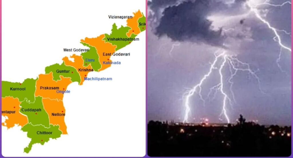 ఆంధ్రప్రదేశ్లోని పలు జిల్లాలకు రాష్ట్ర విపత్తుల నిర్వహణ సంస్థ పిడుగుపాటు హెచ్చరికలు జారీ చేసింది. విజయనగరం, మన్యం, అల్లూరి, విశాఖ జిల్లాలకు ‘రెడ్ అలర్ట్’ ఇచ్చింది. శ్రీకాకుళం, కోనసీమ, కృష్ణా, గుంటూరు, బాపట్ల, పల్నాడు, ప్రకాశం, నెల్లూరు జిల్లాలకు ‘ఆరెంజ్ అలర్ట్’ జారీ చేసింది.
