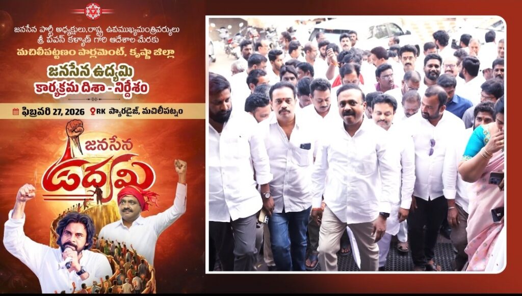 భారత్ న్యూస్ విశాఖపట్నం..జనసేన పార్టీ అధ్యక్షులు,రాష్ట్ర ఉపముఖ్యమంత్రివర్యులు శ్రీ పవన్ కళ్యాణ్ గారి ఆదేశాల మేరకు జనసేన పార్టీ ఉద్యమి సభ్యత్వ నమోదు కార్యక్రమ నిర్వహణకు మచిలీపట్నం పార్లమెంట్ సభ్యులు శ్రీ వల్లభనేని బాలశౌరి గారి అధ్యక్షతన మచిలీపట్నంలోని ఆర్కే ప్యారడైజ్ నందు అట్టహాసంగా జరిగిన జనసేన ఉద్యమి దిశా నిర్దేశ కార్యక్రమం.