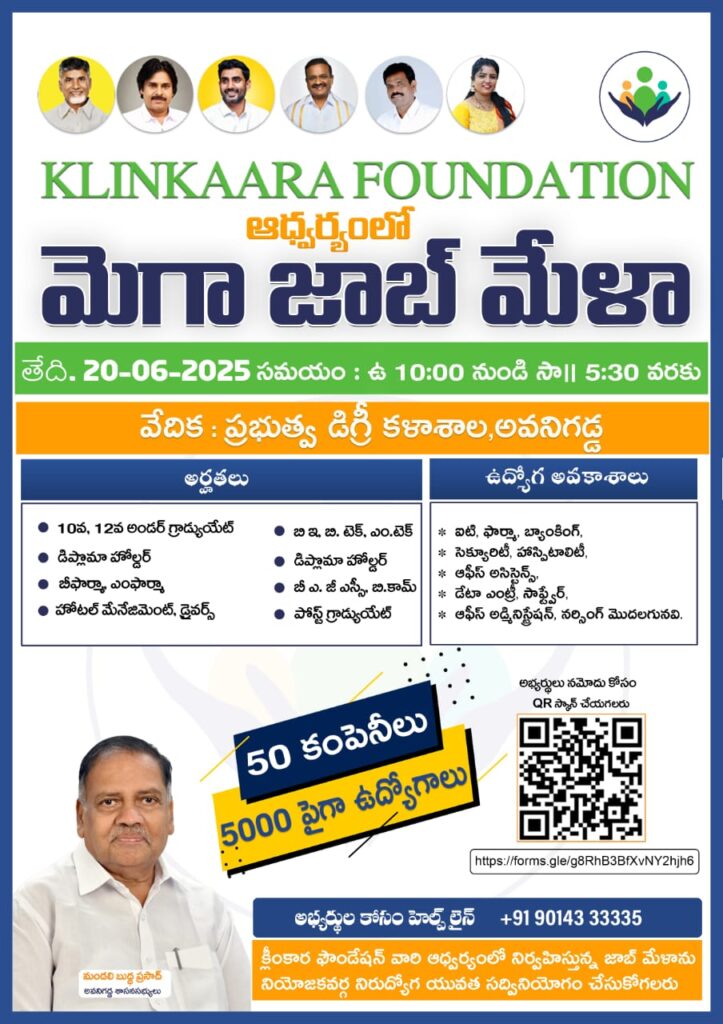 అవనిగడ్డ డిగ్రీ కళాశాల ఆవరణలో ఈనెల 20 వ తేదీన మెగా జాబ్ మేళా నిర్వహించనున్నట్లు క్లిన్ కారా ఫౌండేషన్ మేనేజింగ్ డైరెక్టర్ గుడివాక లక్ష్మీ ఒక ప్రకటనలో తెలిపారు. అవనిగడ్డ నియోజకవర్గంలోని నిరుద్యోగ యువతకు ఉపాధి అవకాశాలు కల్పించాలనే ధ్యేయంతో ఈ మెగా జాబ్ మేళా ఏర్పాటు చేస్తున్నామని, ఈ జాబ్ మేళాలో వివిధ కంపెనీల్లో మేనేజర్, రిటైల్ సేల్స్ ఆఫీసర్, డేటా ఎంట్రీ ఆపరేటర్, టెక్నీషియన్, కెమిస్ట్, తదితర ఉద్యోగాలకు ఇంటర్వ్యూలు నిర్వహిస్తారన్నారు. ఎస్ఎస్సీ, ఇంటర్, ఐటీఐ, డిప్లమో, డిగ్రీ, బీటెక్ ఉత్తీర్ణులైన 35 ఏళ్లలోపు అభ్యర్థులు అర్హులన్నారు. శుక్రవారం ఉదయం అవనిగడ్డ నియోజకవర్గ శాసనసభ్యులు మండలి బుద్ధప్రసాద్ జాబ్ మేళా ను ప్రారంభిస్తారని, ఉదయం 10 గంటల నుండి సాయంత్రం 5 గంటల వరకు ఇంటర్వ్యూలు కొనసాగుతాయని గుడివాక లక్ష్మీ తెలిపారు. ఆసక్తి గల అభ్యర్థులు 9014333335 నంబర్ ని సంప్రదించాల్సిందిగా కోరారు