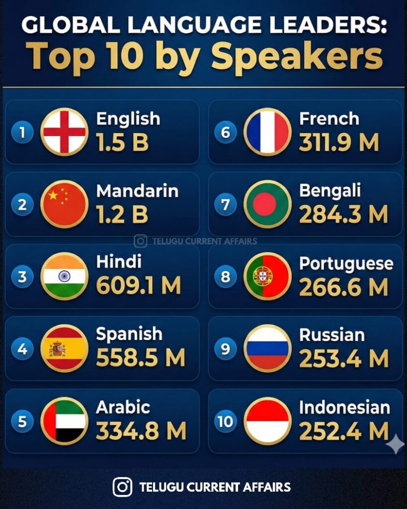 రెండవ స్థానం లో మాండరిన్ ( చైనీస్),మూడవ స్థానంలో హిందీ ఉన్నాయి.