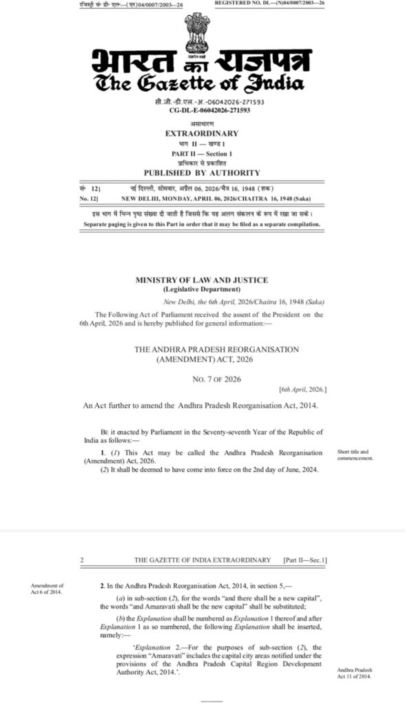 ఈ ఆంధ్రప్రదేశ్ పునర్వ్యవస్థీకరణ (సవరణ) చట్టం, 2026 ప్రకారం, 2014 నాటి ప్రధాన చట్టంలోని సెక్షన్ 5ను సవరిస్తూ అమరావతిని ఆంధ్రప్రదేశ్ రాష్ట్ర నూతన రాజధానిగా అధికారికంగా ఖరారు చేశారు. ఈ సవరణ చట్టం జూన్ 2, 2024 నుండి అమలులోకి వచ్చినట్లుగా పరిగణించబడుతుంది మరియు ఇందులో ‘అమరావతి’ అంటే ఆంధ్రప్రదేశ్ రాజధాని ప్రాంత అభివృద్ధి ప్రాధికార సంస్థ (APCRDA) చట్టం, 2014 కింద నోటిఫై చేయబడిన రాజధాని నగర ప్రాంతాలని స్పష్టం చేశారు. భారత రాష్ట్రపతి ఏప్రిల్ 6, 2026న ఈ చట్టానికి ఆమోదం తెలపగా, భారత ప్రభుత్వ గెజిట్ ద్వారా దీనిని ప్రచురించారు.