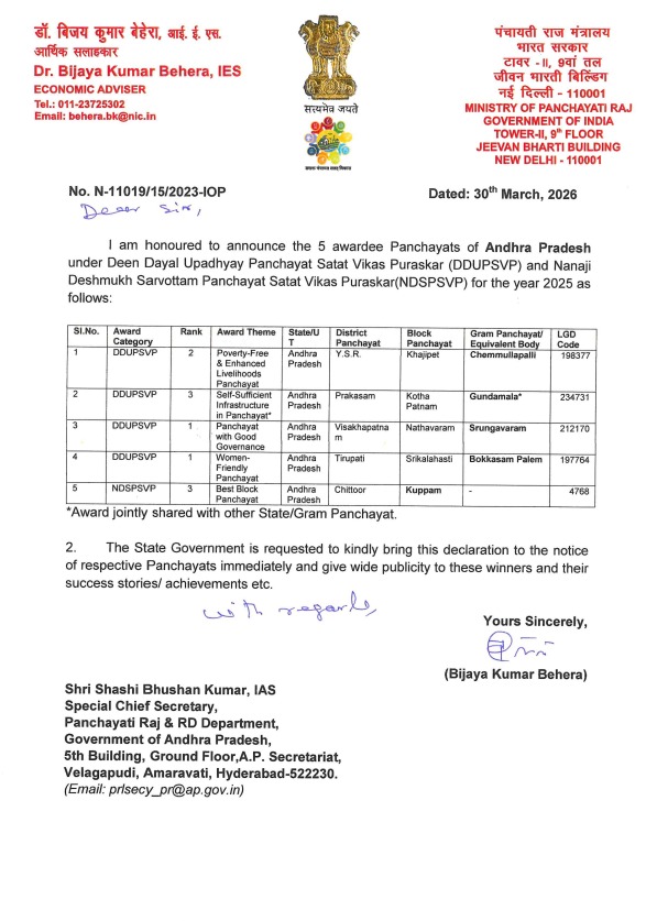ఏపీ పంచాయతీరాజ్ శాఖకు మరోసారి 5 జాతీయ పురస్కారాలు. పంచాయతీరాజ్ శాఖలో రెండు విభాగాల్లో ప్రథమ పురస్కారం. పంచాయతీరాజ్ శాఖలో ఒక విభాగంలో ద్వితీయ పురస్కారం. పంచాయతీరాజ్ శాఖలో మరో రెండు విభాగాల్లో తృతీయ పురస్కారం. వివిధ విభాగాల్లో దేశంలోనే ప్రథమ స్థానంలో ఏపీ పంచాయతీరాజ్ శాఖ. రాష్ట్రీయ గ్రామ స్వరాజ్ అభియాన్లో దేశంలోనే ప్రథమస్థానంలో ఏపీ. దీన్ దయాళ్ ఉపాధ్యాయ, నానాజీ దేశముఖ్ సర్వోత్తమ్ పంచాయత్ సతత్ వికాస్ పురస్కారాలు. వైసీపీ హయాంలో 24వ స్థానంలో ఉన్న ఏపీ.. నేడు దేశంలోనే తొలి స్థానానికి. జల్ సంచయ్. జన్ భాగీదారిలో దేశంలోనే ప్రథమస్థానంలో ఆంధ్రప్రదేశ్. గతేడాది కూడా పలు జాతీయ పురస్కారాలు దక్కించుకున్న పంచాయతీరాజ్ శాఖ.