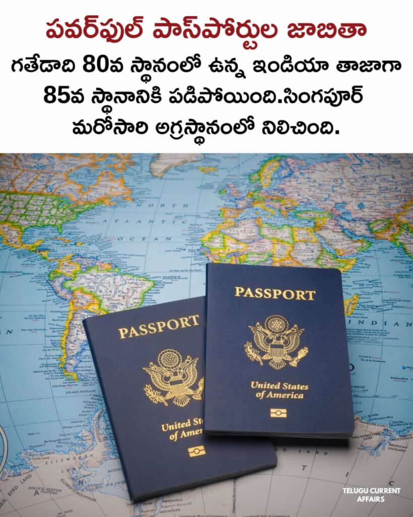 భారత్ న్యూస్ అమరావతి..గతేడాది ఈ జాబితాలో 80వ స్థానంలో ఉన్న ఇండియా.. తాజాగా 85వ స్థానానికి పడిపోయింది. గతేడాది మన దేశ పాస్‌పోర్ట్‌ ఉన్న వారు 62 దేశాల్లో వీసా లేకుండానే పర్యటించే అవకాశం ఉండేది. అది ఇప్పుడు కేవలం 57 దేశాలకు మాత్రమే వీసా లేకుండా ప్రయాణించే వీలు ఉంది. దీంతో ర్యాంకింగ్‌ కూడా పడిపోయింది.