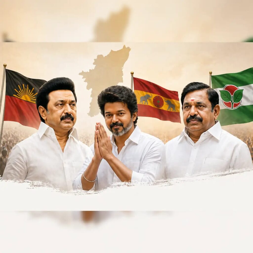 భారత్ న్యూస్ రాజమండ్రి…తమిళనాడు ఎన్నికలో ఎవరి బలం ఎంత.. అధికారం ఎవరిది.. తమిళనాడులో రాష్ట్రవ్యాప్తంగా అసెంబ్లీ ఎన్నికల పోలింగ్ ప్రారంభమయింది. మొత్తం 234 అసెంబ్లీ స్థానాలకుగాన 950 మంది అభ్యర్థులు ఎన్నికల బరిలో ఉన్నారు.ప్రధాన పార్టీలైన డీఎంకే, ఏఐడీఎంకే, టీవీకే మధ్య త్రిముఖ పోటీ నెలకొంది. ఐదేళ్లకు ఒకసారి అధికారాన్నీ మార్చేసే తీర్పునిచ్చే తమిళ తంబీలు ఈ సారి ఏ పార్టీకి అధికారం కట్టబెడతారోనని ఉత్కంఠ నెలకొంది. ఈ త్రిముఖ పోటీలో ఏ పార్టీ బలం ఎంత.. ఎవరు అధికారాన్ని చేజిక్కించుకుంటారో తెలుసుకుందాం..
