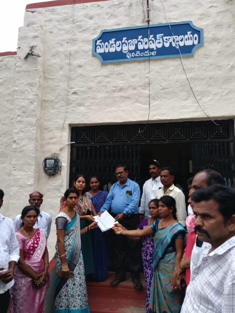 పోలింగ్ కేంద్రాలలో వైసీపీ జెడ్పిటిసి అభ్యర్థి తరఫున ఏజెంట్లను కూర్చొని ఇవ్వలేదని పులివెందుల ఎన్నికల అధికారికి ఫిర్యాదు చేస్తున్న ఏజెంట్లు.