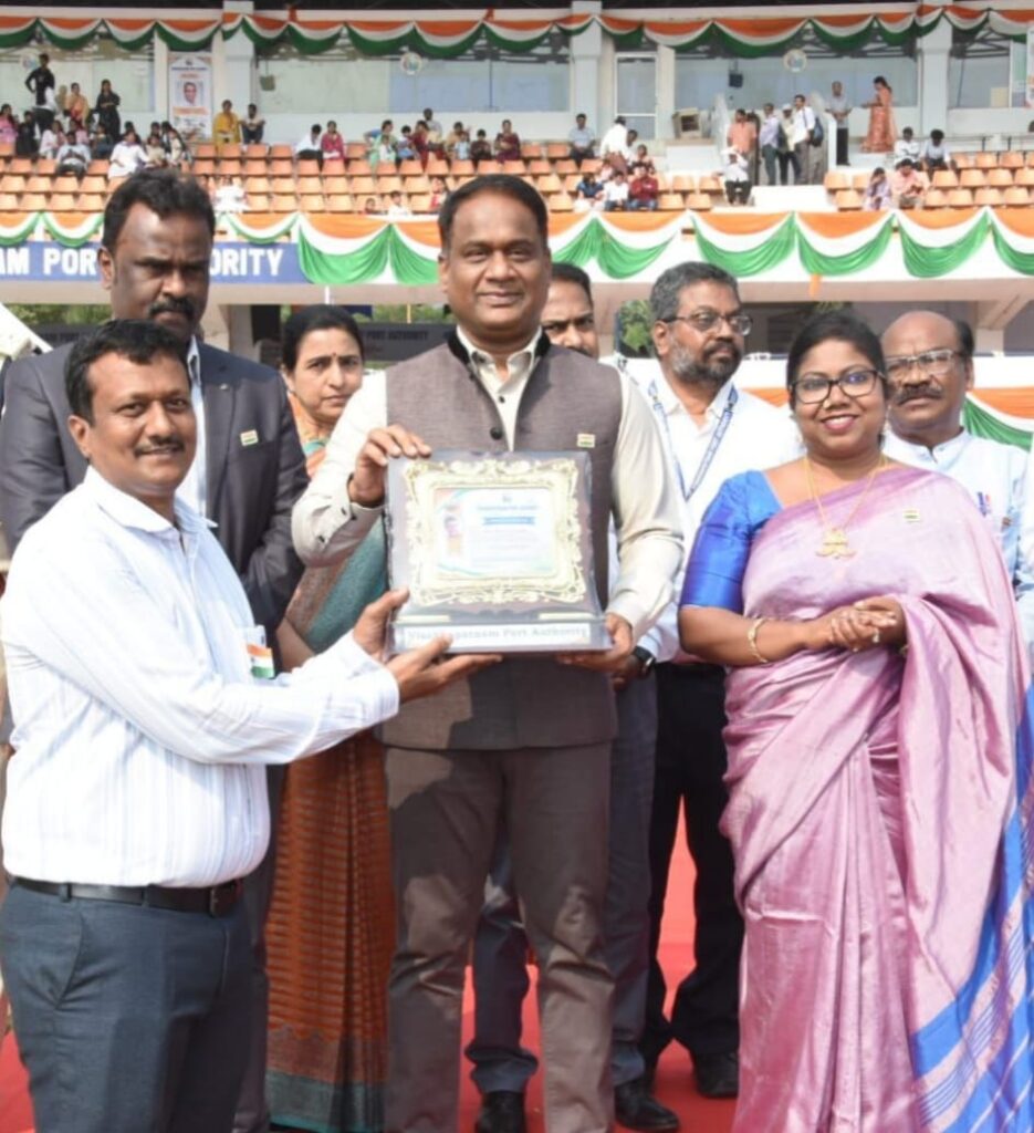 The certificate of appreciation was presented during the Republic Day celebrations held at the Port Stadium in Akkayyapalem. The certificate was presented by the Honorable Chairperson of Visakhapatnam Port Authority, Dr. M. Angamuthu, and the Honorable Deputy Chairperson, Smt. Roshni Aparanji Korati.