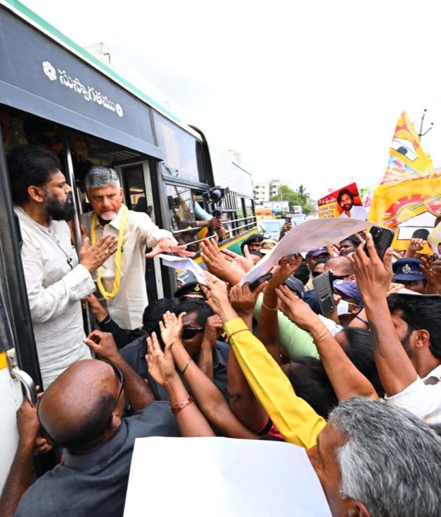 From the Mangalagiri RTC Bus Stand, Chief Minister Chandrababu, Deputy CM Pawan Kalyan, and Minister Nara Lokesh launched the ‘Divyang Shakti’ free bus scheme today.