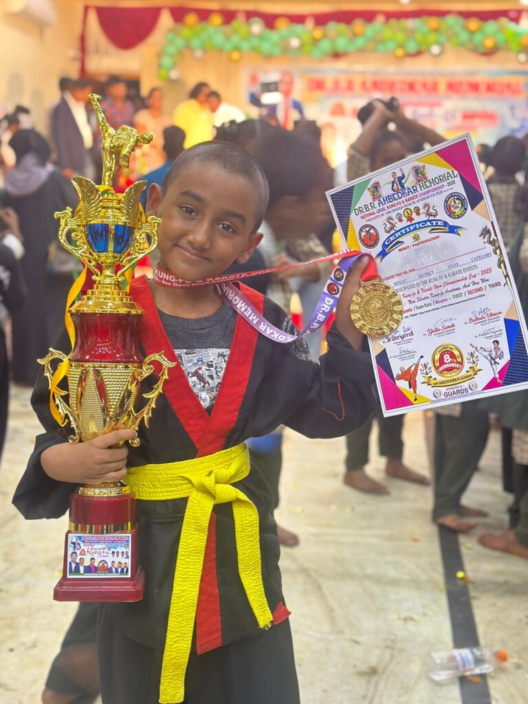 In the Dr. B. R. Ambedkar Memorial National Level Kung Fu and Karate Championship 2025 held in Chilakaluripet on the 14th of this month, Tejavir, the grandson of prominent journalist Chaladi Poornachandra Rao from Machilipatnam, who had won two silver medals in an international competition organized by the World Association of Kickboxing India (WAKO) in New Delhi last year, emerged as a winner at the international level.
