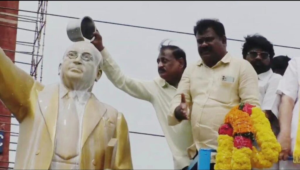 TDP official spokesperson Patarla Ramesh anointed Ambedkar’s statue in Vijayawada.