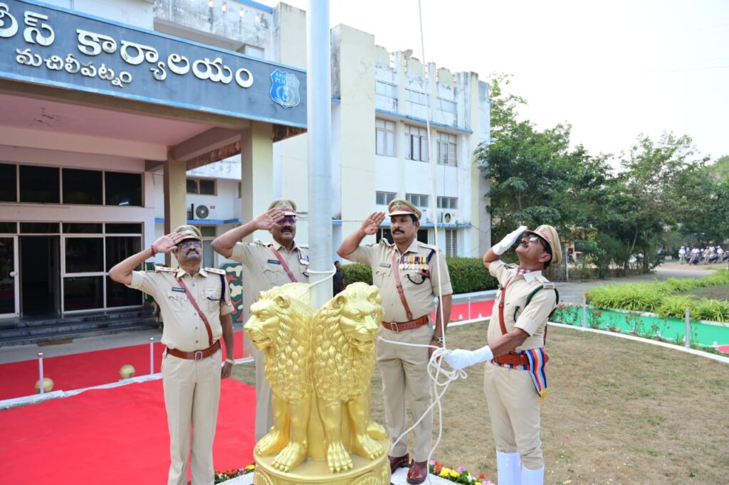కృష్ణాజిల్లా పోలీస్ శాఖ ఆధ్వర్యంలో 77వ గణతంత్ర దినోత్సవ వేడుకలు అంబరాన్నంటాయి.జిల్లా ఎస్పీ శ్రీ వి. విద్యాసాగర్ నాయుడు ఐపీఎస్ గారి ఆదేశాల మేరకు అడిషనల్ ఎస్పీ అడ్మిన్ శ్రీ వి.వి నాయుడు గారు, అడిషనల్ ఎస్పి ఏఆర్ సత్యనారాయణ గారు, ఇతర పోలీసు అధికారులతో కలిసి జాతీయ జెండాను ఎగురవేసి గౌరవ వందనం సమర్పించి సిబ్బందికి శుభాకాంక్షలు తెలియజేశారు.
