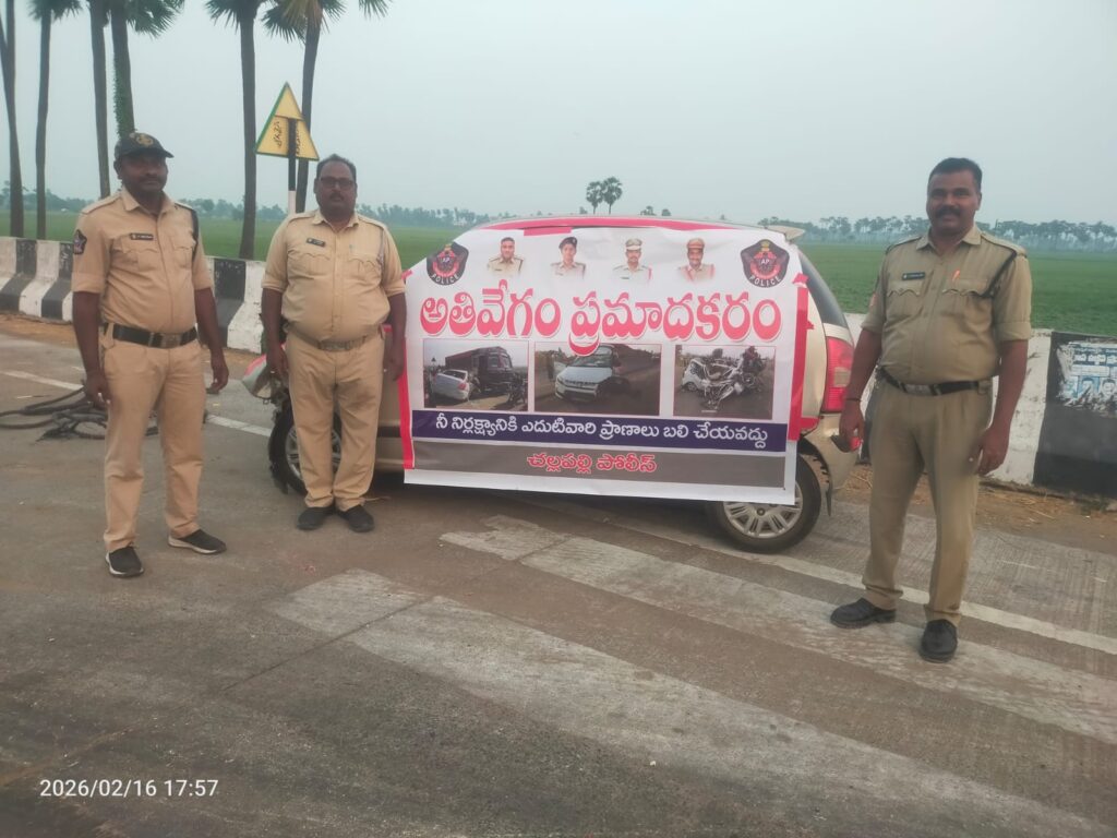 అతివేగం ప్రమాదకరమని ప్రజల్లో అవగాహన కల్పించేందుకు చల్లపల్లి పోలీసులు వినూత్నంగా ప్రచారం చేస్తున్నారు. గతంలో ప్రమాదానికి గురైన కారును తీసుకువచ్చి 216 జాతీయ రహదారి పక్కన ఉంచారు. దానిపై ప్రమాదాలు జరిగిన వాహనాల ఫొటోలు ముద్రించి అంటించారు. ఆ మార్గంలో రాకపోకలు సాగించేవారిని దీని ద్వారా అప్రమత్తం చేసి వారు సురక్షితంగా గమ్యం చేరాలనే ఉద్దేశ్యంతో ఇలా ఏర్పాటుచేసినట్లు చల్లపల్లి ఎస్ఐ డి.దుర్గాంజనేయులు తెలిపారు.