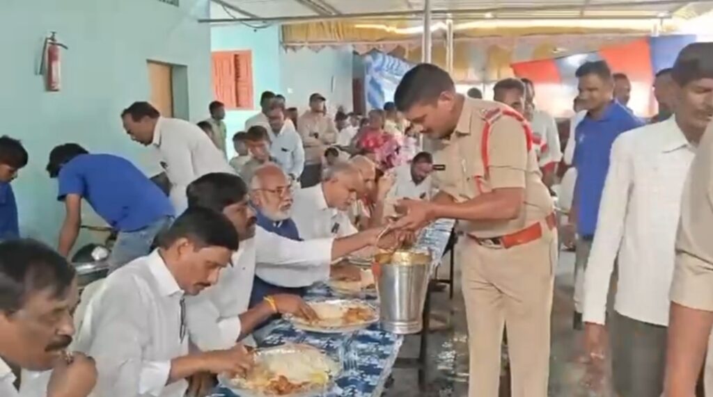 కాంగ్రెస్ నాయకులకు స్వయంగా వడ్డిస్తూ క్యాటరింగ్ పనులు చేస్తున్న సీఐ