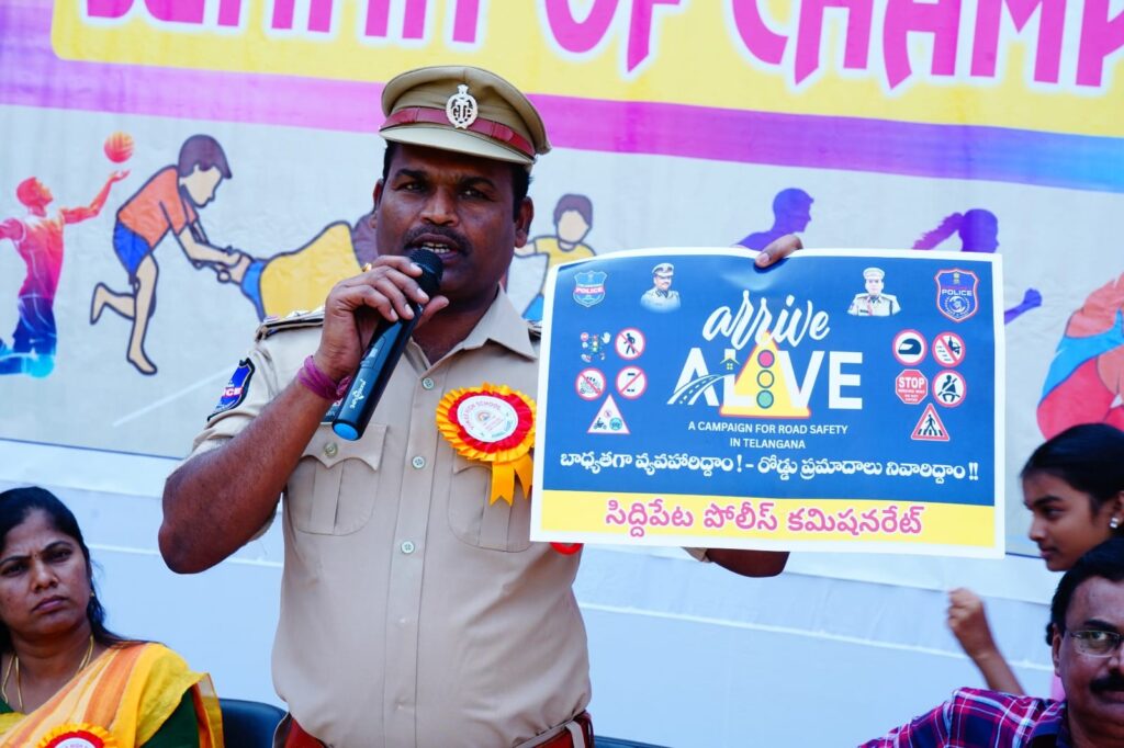 Siddipet Three Town CI Vidyasagar urged every vehicle driver to follow road rules and reach home safely. As part of the ‘ARRIVE ALIVE’ program being conducted across Siddipet district, an awareness session on road safety was held today at Vikas High School in Siddipet town. Siddipet Three Town Inspector Vidyasagar participated in this program and guided the motorists on road rules.