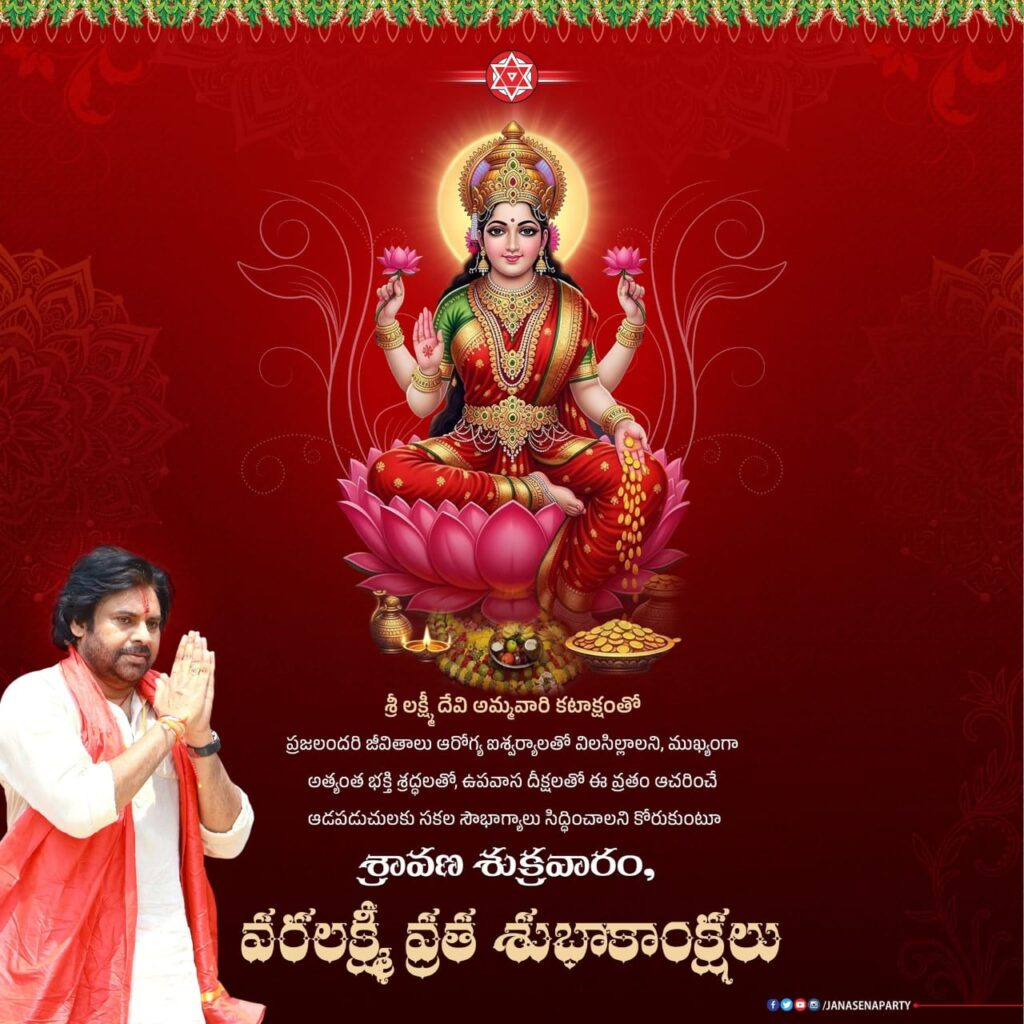 భారత్ న్యూస్ విజయవాడ…శ్రీ లక్ష్మీ దేవి అమ్మవారి కటాక్షంతో ప్రజలందరి జీవితాలు ఆరోగ్య ఐశ్వర్యాలతో విలసిల్లాలని, ముఖ్యంగా అత్యంత భక్తి శ్రద్ధలతో, ఉపవాస దీక్షలతో ఈ వ్రతం ఆచరించే ఆడపడుచులకు సకల సౌభాగ్యాలు సిద్ధించాలని కోరుకుంటూ శ్రావణ శుక్రవారం, వరలక్ష్మీ వ్రత శుభాకాంక్షలు.