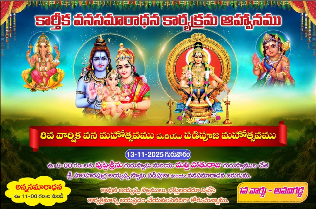 భారత్ న్యూస్ గుంటూరు…రేపు అనగా 13-11-2025 గురువారం ఉదయం 10 గంటలు కీ మన అవనిగడ్డ లో ఉన్న 1 వ వార్డు ప్రజలు గత 7 సంవత్సరాలు గా కార్తీక వనభోజనాలు ఏర్పాటు చేస్తూ , ఈ సంవత్సరం కూడా కోడూరు రోడ్డు లో మూడు బొమ్మలు సెంటర్, బస్ స్టాప్ పక్కన సందులో 8 వ సంవత్సరం కార్తీక వన సమారాధన కార్యక్రమం పుట్ట శ్రీను గురు స్వామి గారి పడి పూజా కార్యక్రమం, పోతురాజు గురు స్వామి భజన కార్యక్రమం , అయ్యప్పస్వాములు, భవానీలు,శివ స్వాములు,కుమార స్వాములు, గోవింద భక్తులు మరియు అందరి భక్తులు కీ సుమారుగా 2,000 నుంచి 2,500 మందికి అన్నసమారాధన నిర్వహించడం జరుగుతుంది.ఈ పడిపూజ,భజనా,సద్ది కార్యక్రమం కి మన అవనిగడ్డ నియోజకవర్గం జనసేన పార్టీ శాసనసభ్యులు డాక్టర్ మండలి బుద్ధప్రసాద్ గారు తనయులు యవనాయకులు మండలి వెంకట్రామ్ రాజాబాబు గారు కూడా విచ్చేయనున్నారు కావున మనందరం కూడా ఈ కార్తీకమాసంలో ఈ గొప్ప అవకాశాన్ని మనందరం కూడా తరలి వెళ్ళి తీర్ధ ప్రసాదాలు స్వీకరిద్దామని, అందుబాటులో ఉన్న కూటమి నాయకులు, కార్యకర్తలు, వీర మహిళలు ఈ కార్యక్రమానికి హాజరై ఈ కార్యక్రమం ని విజయవంతం చేయాలని తెలియజేస్తూ..