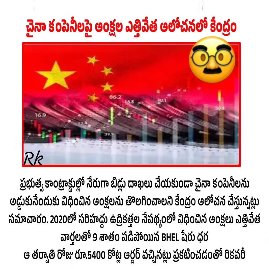 భారత్ న్యూస్ ఢిల్లీ….చైనా కంపెనీలపై ఉన్న ఆంక్షలను ఎత్తివేసి ప్రభుత్వ కాంట్రాక్టుల బిడ్డింగ్‌కు అనుమతిచ్చే అంశంపై భారత ఆర్థిక శాఖ యోచిస్తున్నట్లు తెలుస్తోంది. ఈ వార్త బయటకు వచ్చిన క్రమంలో హైదరాబాద్ కంపెనీ బీహెచ్ఈఎల్ షేరు ఒక్కసారిగా కుప్పకూలింది. ఏకంగా 10 శాతం మేర పడిపోయింది. అయితే, రాత్రికి రాత్రే సీన్ రివర్స్ అయింది. మరుసటి రోజునే ఈ స్టాక్ వేగంగా కోలుకుంది. ఈరోజు లాభాల్లో ట్రేడవుతోంది.