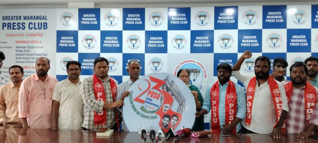ఈ కార్యక్రమానికి ముఖ్యఅతిథిగా హాజరైన PDSU రాష్ట్ర మహాసభల ఆహ్వాన సంఘం అధ్యక్షులు,ప్రొఫెసర్ కాత్యాయని విద్మహే ఆహ్వాన సంఘం ప్రధాన కార్యదర్శి మైసా శ్రీనివాస్ మాట్లాడుతూ* చారిత్రాత్మక పోరాట వారసత్వం ఉన్న PDSU రాష్ట్ర మహాసభలు ఉద్యమాల కేంద్రం వరంగల్ జిల్లాలో నిర్వహించడం అభినందనీయమన్నారు. కేంద్ర రాష్ట్ర ప్రభుత్వాలు అనుసరిస్తున్న విధానాల వల్ల విద్య పేదలకు మరింత దూరం అవుతుందన్నారు. భారతదేశానికి స్వాతంత్రం వచ్చి 75 ఏళ్లు గడిచినా నేటికీ విద్యా వైద్యం ఉపాధి అవకాశాలు పేద బడుగు బలహీన వర్గాలకు అందకుండా ప్రభుత్వాలు తమ విధానాలనురూపొందించుకుంటున్నాయన్నారు. పాలకులు కార్పొరేట్, పెట్టుబడే దారులకు ఊడిగం చేసేందుకే ప్రభుత్వా లను నడుపుతున్నాయన్నారు. ప్రభుత్వ విద్యారంగం ధ్వంసం అవుతుందని అనేక పాఠశాలలు కళాశాలలు యూనివ ర్సిటీలు మూసివేత గురి అవ్వడమే దీనికి తార్కాణం అన్నారు. కేంద్రంలోని నరేంద్ర మోడీ ప్రభుత్వం దేశంలోనే ఉన్న చట్టాలను కార్పొరేట్ పెట్టుబడిదారులకు అనుకూలంగా మార్చారన్నారు. ఇప్పటికే ప్రభుత్వ రంగ సంస్థలు అన్నీ ప్రైవేటుప రం అయ్యాయని, విద్యా రంగాన్ని కూడా పూర్తిగా ప్రవేట్ పరం చేసేందుకు నూతన జాతీయ విద్యా విధానం 2020 తీసుకొ చ్చిందన్నారు. దీంతో దేశంలోని ప్రతిష్టా త్మక యూనివర్సిటీలలో కోర్స్ ఫీజులు ఎగ్జామినేషన్ ఫీజులు పెరిగి ఆర్థిక భారం తో విద్యార్థులు ఉన్నత చదువులకు దూ రం అవుతున్నారన్నారు. విద్యార్థుల మెదలను కలుషితం చేయడం కోసం పాఠ్యాంశాల్లోమూఢనమ్మకాలను,మతోన్మాదం ను చెప్పిస్తుందన్నారు. ఎన్సీఈఆ ర్టీ పాఠ్యాంశాల్లో గాంధీని చంపిన గాడ్సే పాఠాలను తీసివేయడం చరిత్ర వక్రీకరణ లో భాగమే అన్నారు. ప్రపంచంలో వివిధ దేశాల్లో విద్యార్థులు యువకులు విద్యార్థి వ్యతిరేక విధానాలకు వ్యతిరేకంగా పో రాటాలు నడుస్తున్నాయన్నారు. విద్యార్థు ల పోరాటాలతో ఆఫ్ఘనిస్తాన్ బంగ్లాదేశ్ శ్రీలంక నేపాల్ లాంటి దేశాల్లో ప్రభుత్వా లే కూలిపోయాయని అన్నారు. అంతర్జా తీయ విద్యార్థి ఉద్యమాల స్ఫూర్తితో దేశం విద్యార్థులోకం పోరాటాలకు సిద్ధం కావాలని పిలుపునిచ్చారు జార్జిరెడ్డి జంపాల చంద్రశేఖర ప్రసాద్,శ్రీపాద శ్రీహరి,రంగవల్లి కోలాశంకర్, దుస్సా చేరాలు లాంటి ఎందరో విద్యార్థి అమరవీరుల త్యాగంతో పురుడోసు కున్న PDSU సంస్థ విద్యార్థుల ఉద్యమా న్నీ తీవ్రతరం చేయాలని ఆకాంక్షించారు. తెలంగాణలో రేవంత్ రెడ్డి సర్కార్ అధి కారంలోకి వచ్చి రెండు సంవత్సరాలు గడుస్తున్నా విద్యార్థుల సమస్యలను పరిష్కరించడంలో విఫలమైందన్నారు. కనీసం పెండింగ్లో ఉన్న ఫీజు రీయింబ ర్స్మెంట్ స్కాలర్షిప్ కూడా విద్యార్థులకు ఇవ్వకుండా మొండిగా వ్యవహరిస్తుం దన్నారు. దీంతో విద్యార్థుల భవిష్యత్తు