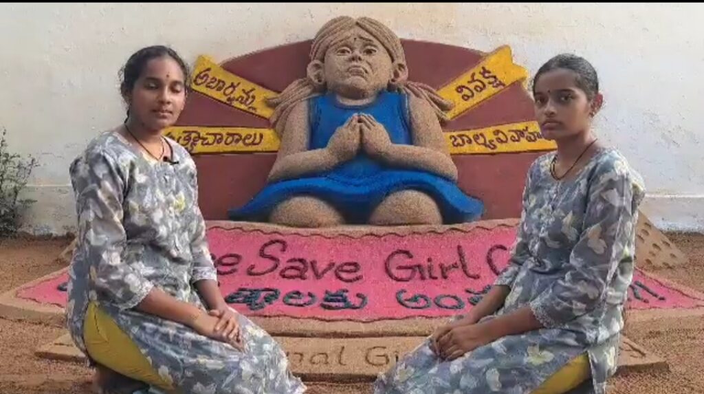 బాలికలను కాపాడండి అన్న నినాదాలతో సైకత శిల్పంన్ని రూపొందించిన రంగంపేట సిస్టర్స్