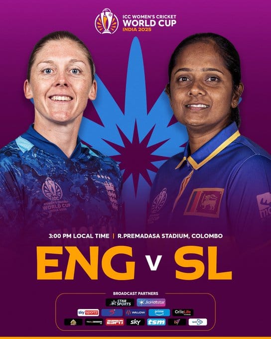 భారత్ న్యూస్ విజయవాడ…మహిళల వన్డే క్రికెట్ ప్రపంచ కప్ పోటీల్లో భాగంగా ఈ రోజు మధ్యాహ్నం మూడు గంటల నుంచి కొలంబోలో జరిగే మ్యాచ్ లో ఇంగ్లండ్ , శ్రీలంక జట్లు పోటీ పడతాయి