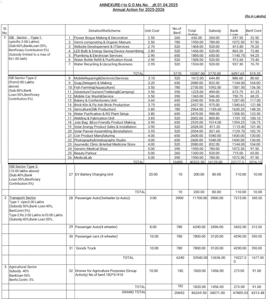 2025 – 26 సంవత్సరానికి ఎస్సీ కార్పోరేషన్ ద్వారా పలు యూనిట్ల ప్రాతిపదికన ఆర్థిక చేయూత రుణాలు అందించడానికి ప్రభుత్వం మార్గదర్శకాలు విడుదల చేసింది. దీని ప్రకారం ఏప్రిల్ 11 నుండి రాష్ట్ర వ్యాప్తంగా ఆన్ లైన్ రిజిస్ట్రేషన్స్ ప్రారంభం అవుతాయి. ఇందులో మెడికల్ షాపు, మెడికల్ ల్యాబ్, ఎలెక్ట్రిక్ బ్యాటరీ ఛార్జింగ్ యూనిట్, ఎలెక్ట్రిక్ ఆటో, పాసింజర్ కార్ (4 వీలర్), గూడ్స్ ట్రక్ తదితర యూనిట్ల ద్వారా అవకాశం కల్పించనున్నట్లు తెలిపారు.