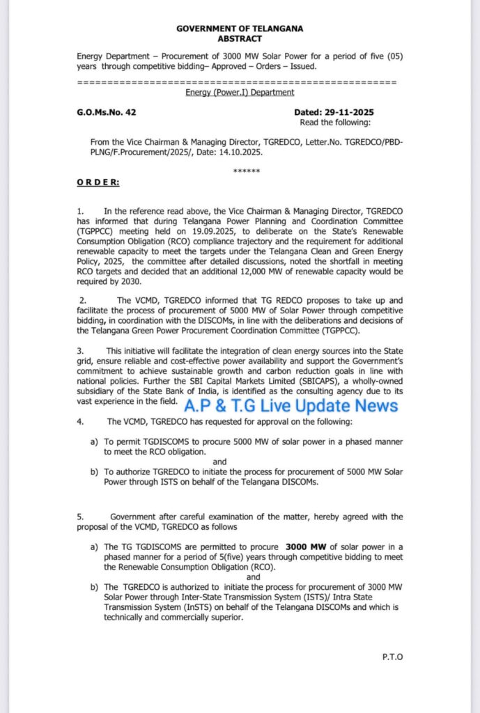 భారత్ న్యూస్ తెలంగాణ జిల్లా,,తెలంగాణలో కొత్తగా 3 వేల మెగావాట్ల సోలార్ విద్యుత్తు కొనుగోలుకు ప్రభుత్వం గ్రీన్ సిగ్నల్