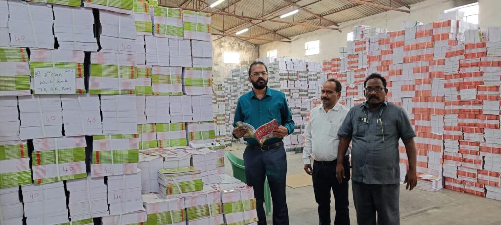 పాఠశాలలు తెరిచే నాటికి రాష్ట్ర ప్రభుత్వము అన్ని పాఠశాలలకు ఉచిత పాఠ్యపుస్తకాలు పంపిణీ చేసేందుకు సన్నద్ధంగా ఉన్నదని గుంటూరు జిల్లా విద్యాశాఖ అధికారి డాక్టర్ షేక్ సలీం భాష అన్నారు నేడు అమరావతి రోడ్డు లోని పాఠ్యపుస్తకాల గోడెన్ను తనిఖీ చేసి ఈ సందర్భంగా టెస్ట్ బుక్ మేనేజర్ వి వజ్రబాబు ను అడిగి అన్ని వివరాలు తెలుసుకున్నారు ఈ సందర్భంగా వారు మాట్లాడుతూ ఉమ్మడి జిల్లా వ్యాప్తంగా 15 లక్షల 84 వేల 322 పుస్తకములు ఒకటవ తరగతి నుండి పదవ తరగతి వరకు అవసరం అవ్వగా ప్రస్తుతం 9 లక్షల 67 వేల 938 పుస్తకాలు జిల్లా గోడెన్ కు రావడం జరిగిందని మిగిలిన పుస్తకాలు కూడా రెండు రోజుల్లో రావడం జరుగునని,వచ్చే నెల ఒకటో తేదీ నుండి ఆర్టీసీ కార్గో ద్వారా ఉమ్మడి జిల్లాలోని అన్ని మండలాలకు పాఠ్యపుస్తకాలు పంపనున్నట్లు, ఒకటో తరగతి నుండి ఎనిమిదో తరగతి వరకు మారిన సిలబస్ ప్రకారం పుస్తకాలు వచ్చినట్లు సలీం భాష తెలిపారు పాఠ్యపుస్తకాల మేనేజర్ ఈ విషయంలో ఎటువంటి తేడా లేకుండా సరఫరా జరిగేటట్లు చూసుకోవాలని వారు అన్నారు పాఠ్యపుస్తకాల మేనేజర్ వజ్రబాబు, మాట్లాడుతూ తప్ప