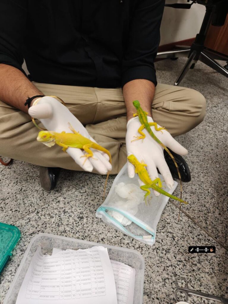అతని దగ్గర నుంచి ఒక మానిటర్ బల్లి ఒక రెండు తలల ఎర్ర చెవి స్పైడర్ తాబేలు నాలుగు ఆకుపచ్చ ఇగువాన