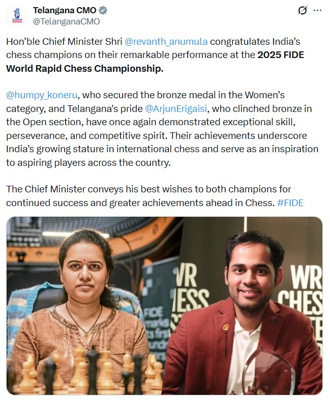 అసాధారణ నైపుణ్యం, పట్టుదల, పోటీతత్వం ప్రదర్శిస్తూ అంతర్జాతీయ చెస్ టోర్నమెంట్ లో దేశానికి, తెలంగాణకు గర్వకారణంగా నలిచారంటూ ప్రశంస