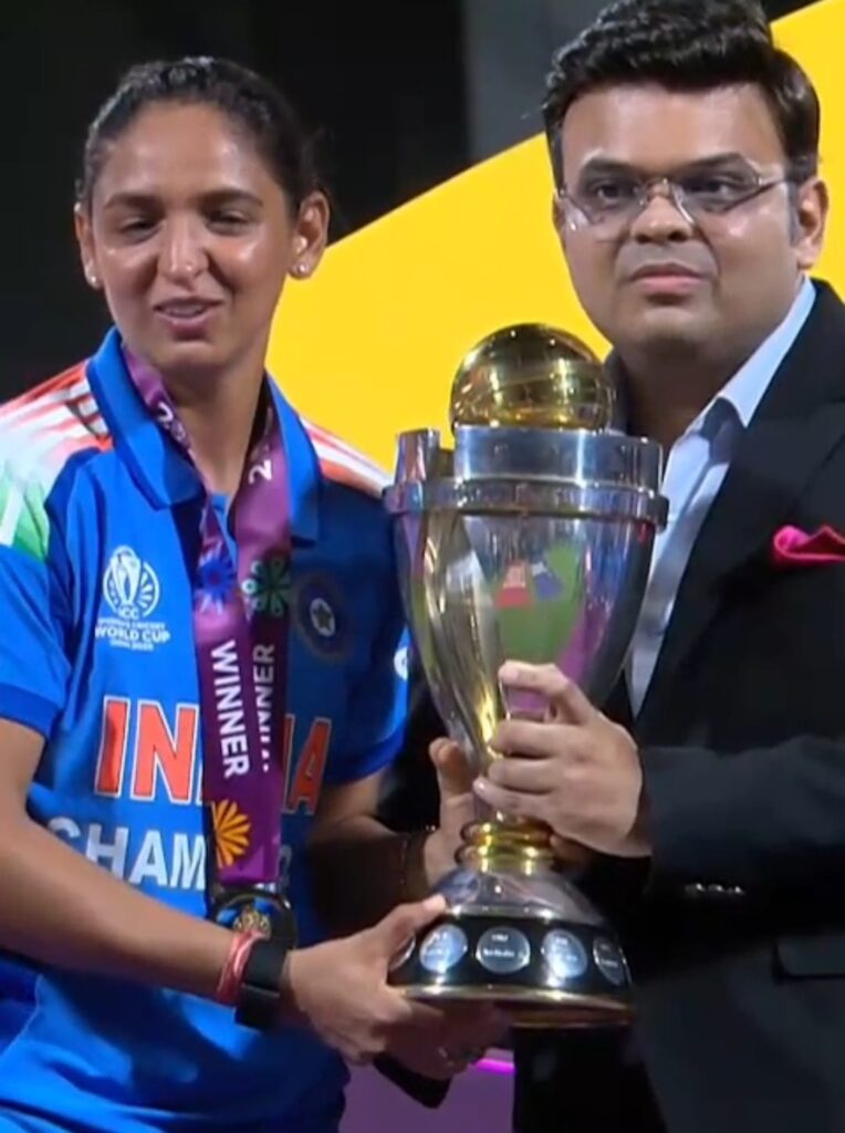 భారత మహిళల జట్టు తొలిసారి వన్డే వరల్డ్ కప్ సాధించింది. ఐసీసీ ఛైర్మన్ జై షా నుంచి భారత కెప్టెన్ హర్మన్ ప్రీత్ కౌర్ సగర్వంగా ట్రోఫీ అందుకున్నారు. అనంతరం ట్రోఫీతో మహిళా క్రికెటర్లు సంబరాలు చేసుకున్నారు. భావోద్వేగంతో మహిళా క్రికెటర్లంతా ఒకరినొకరు అభినందించుకున్నారు. ఇక స్టేడియంలో ప్రేక్షకులు హర్షధ్వానాలతో హోరెత్తించారు. కళ్లు మిరుమిట్లు గొలిపేలా రంగురంగుల కాంతులు వెదజల్లుతూ సాగిన బాణసంచా పేలుళ్లు ప్రత్యేక ఆకర్షణగా నిలిచాయి.
